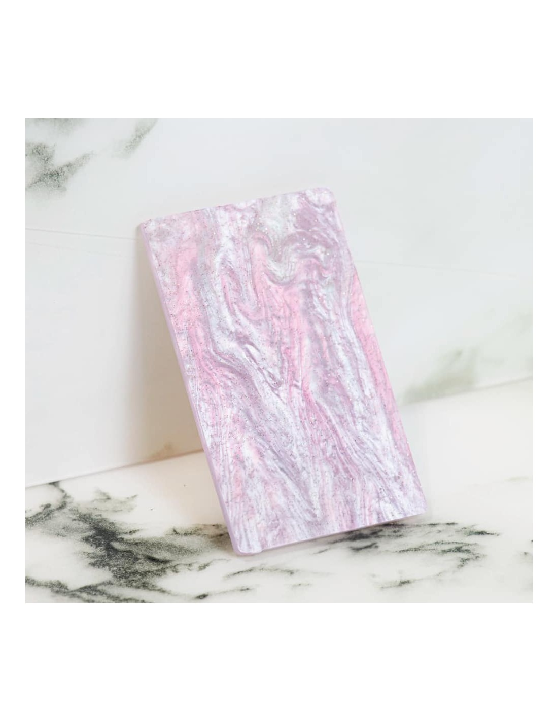 Es un nacarado rosa suave y aterciopelado infundido con matices cálidos, reflejos perla, azulados, violetas, y enriquecido con motas brillantes de purpurina