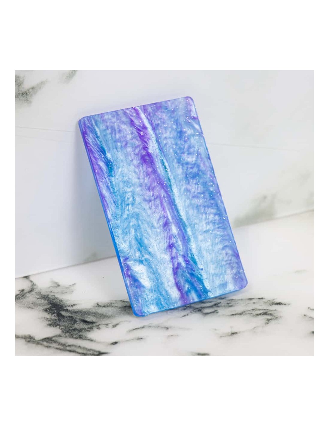Es un nacarado azul suave y aterciopelado infundido con matices cálidos, reflejos perla, grises, violetas, y enriquecido con motas brillantes de purpurina